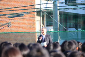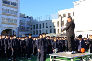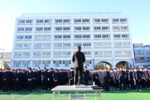 冬晴れの寒空の下、校庭に全校生徒が集まり、新学期のスタートを迎えました。