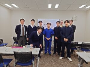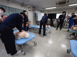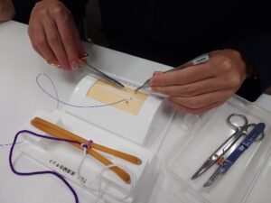 まず、BLS講習を行い、マネキンとAEDトレーナーを用いた心肺蘇生実習の後、ICU(集中治療室)の初療室、EICU(救命集中治療室)で最先端の医療現場を見学させていただきました。その後、外科手術をはじめとする各種医療処置において用いられる、身体の組織や挿入された医療機器などを縫合糸などで固定する技術である縫合結紮体験を行いました。