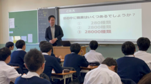 この授業は東京都「金融経済教育に関する講師派遣事業」の一環で、一般社団法人日本金融教育支援機構から各クラス1名、合計6名の講師をお招きして実施しました。今回で3回目の実施となります。